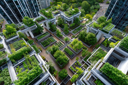 Aerial view of a green rooftop garden on a modern urban building