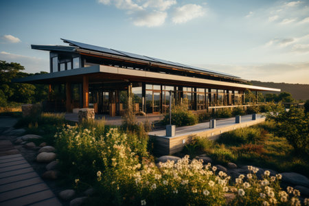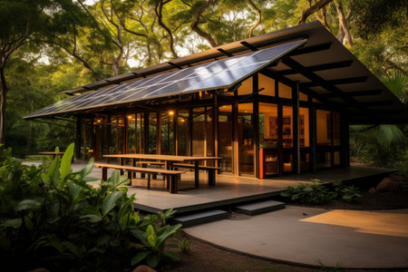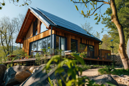 Modern house with solar panels, surrounded by green wooden deck, eco-friendly living, electricity