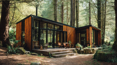 A stylish cabin made of wood blends with the surrounding forest. The large windows invite natural light, and a porch offers a cozy outdoor space.