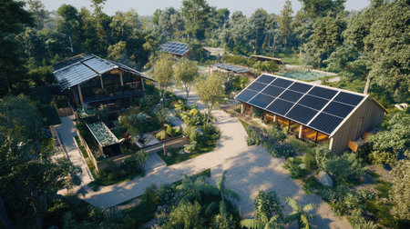 This picturesque aerial view showcases an eco village designed for sustainable living, featuring modern architecture, solar panels, and vibrant greenery.