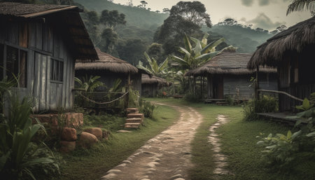Rustic hut in tranquil meadow surrounded by lush tropical forest generated by artificial intelligence