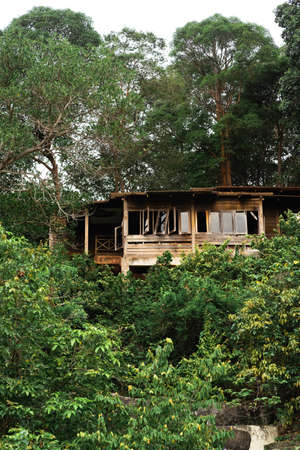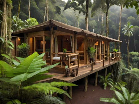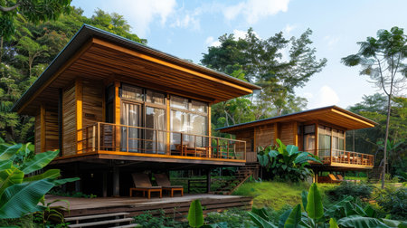 Wooden bungalow nestled in a lush tropical rainforest setting, with a pathway leading to a tranquil retreat, offering a luxurious and eco-friendly escape