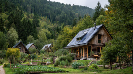 Rustic wooden homes nestled among vibrant trees and gardens create a peaceful retreat, showing natural beauty and environmental harmony in the mountains.