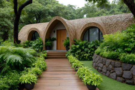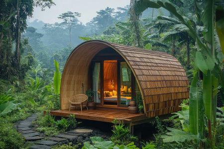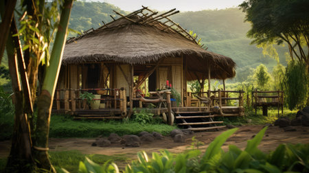 A charming bamboo cottage nestled in a vibrant green forest, showcasing eco-friendly architecture amidst a tranquil and serene landscape. Perfect for nature lovers.