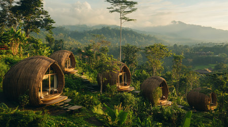 Beautiful modern dome houses nestled in a tropical landscape, showcasing sustainable living and harmonious design with nature, ideal for retreats or vacations.