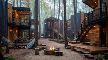Aerial view of charming wooden eco friendly houses blending seamlessly with a vibrant green garden and a dense, tranquil forest