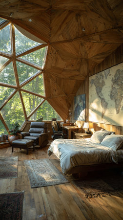 This cozy bedroom features a geodesic dome design with large windows offering a serene view of the surrounding forest. Wooden accents and modern furniture create a warm atmosphere.