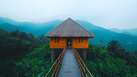 This image showcases a wooden treehouse connected by a wooden bridge, surrounded by vibrant greenery, creating a serene atmosphere amidst misty mountains.