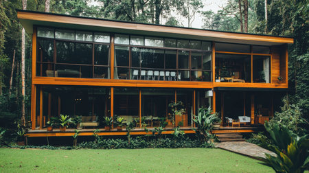 A modern glass house integrated into a lush forest setting, showcasing a blend of architecture and nature. The design emphasizes large windows and open spaces.