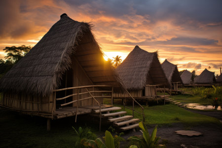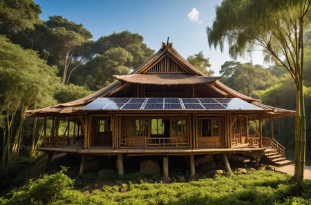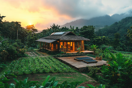 Cozy jungle home with solar panels enjoying a beautiful sunset, promoting sustainable living and eco-tourism