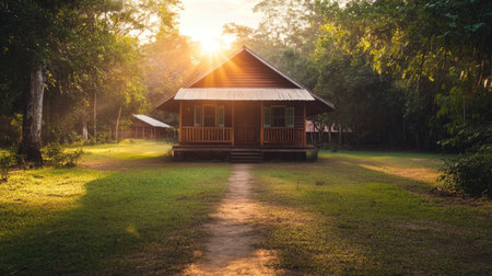 A peaceful wooden cabin stands in a lush forest, surrounded by natural beauty and basking in the warm glow of sunlight during golden hour, ideal for a retreat.