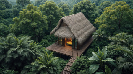 tropical hut in jungle interior design amid dense greenery, created with generative ai