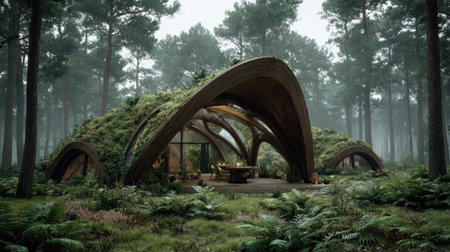 A stunning eco-friendly architectural design nestled in a serene forest, featuring organic shapes, natural materials, and a harmonious blend with the surrounding landscape.