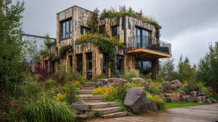 A stunning modern wooden house nestled in a vibrant garden, emphasizing eco-friendly architecture and the beauty of nature in a serene outdoor setting.