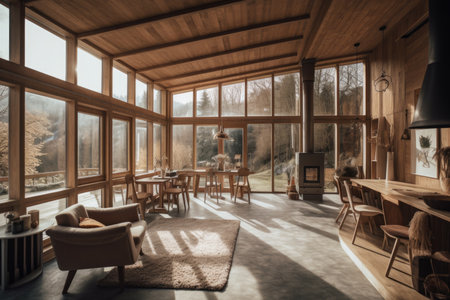 cozy warm home interior of a chic country chalet with a huge panoramic window overlooking the winter forest. open plan, wood decoration, warm colors and a family hearth. Generative AI
