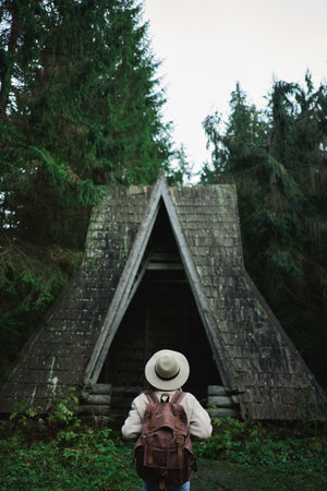 Vertical image back view traveler girl with backpack standing in front of old vintage style wooden house chalet in the dark forest