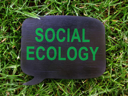 Close-up of dark green leaf in a garden setting with the word 'ECOLOGY' in the background, emphasizing nature and environmental themes.