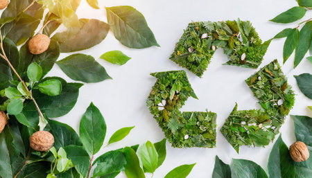 A creative green recycling symbol constructed with lush leaves and organic elements on a white backdrop, perfect for promoting environmental responsibility, sustainable practices, and