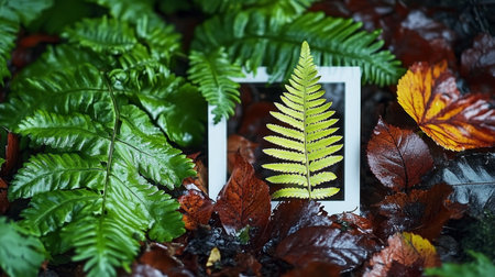 Fern Surrounded by Autumnal Foliage in a Natural Frame, Minimalist Woodland Composition Art