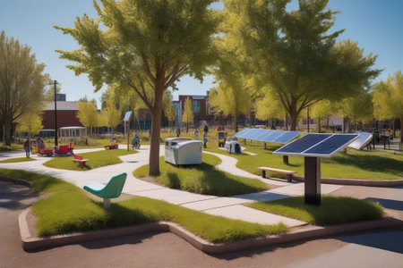 Urban landscape with solar panels showing a commitment to sustainable, green energy.