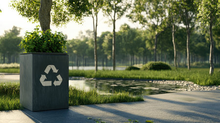 A modern recycling bin stands prominently in a tranquil park, surrounded by vibrant greenery and a peaceful water body, symbolizing commitment to sustainability and eco-consciousness.