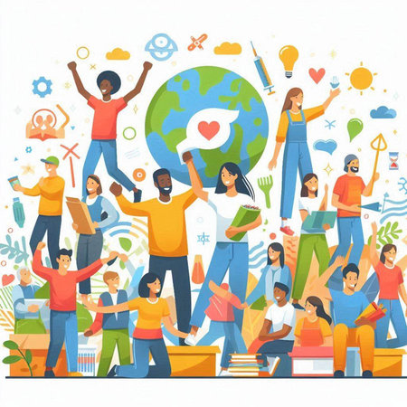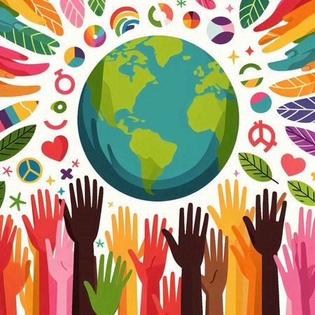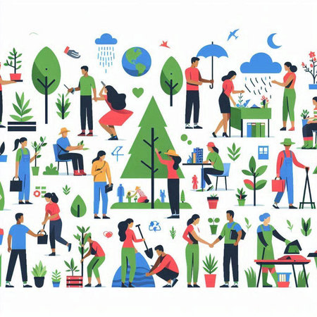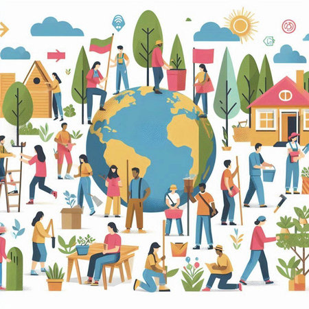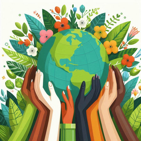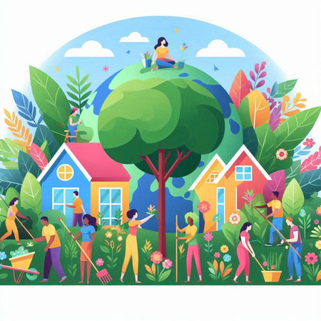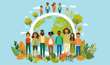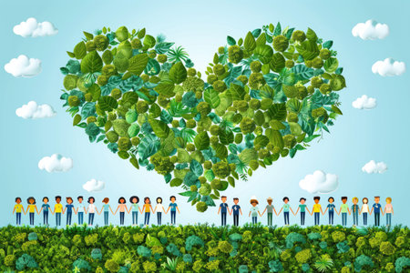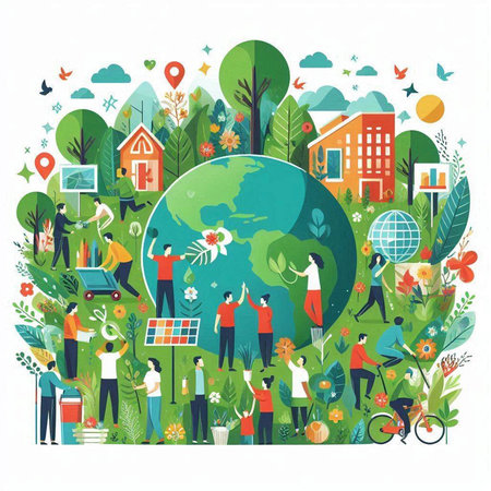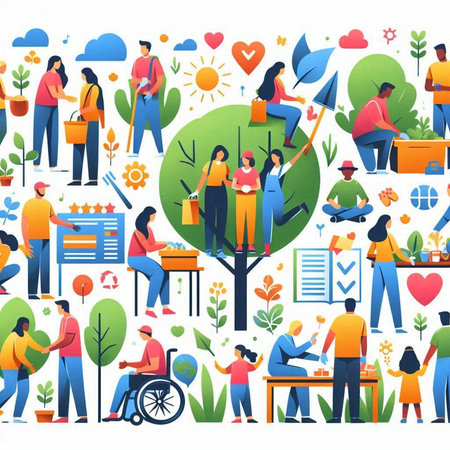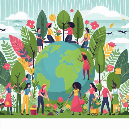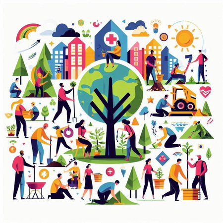 A vibrant scene showcases diverse figures holding hands around a sprouting plant, symbolizing unity and environmental care in a lush natural setting.