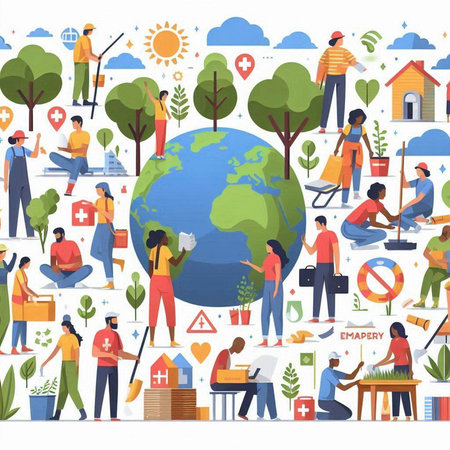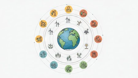 This illustrative image features a central globe surrounded by a ring of icons depicting ecological concepts. The artwork uses a clean style with a white background and subtle shading. The overall composition suggests environmental awareness and the interconnectedness of various sustainability initiatives. Suitable for diverse editorial and commercial applications.