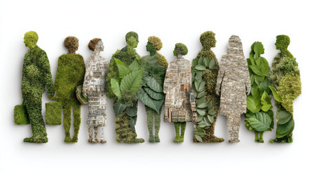 Silhouettes of people crafted from leaves, grass, and urban textures, promoting environmental unity.