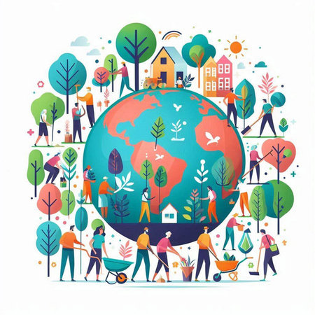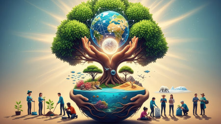 An illustration features a tree with a globe atop and hands cradling the planet, surrounded by trees and figures. The image showcases vibrant colors with a soft, warm lighting. This conceptual artwork may be suitable for environmental awareness and ecological themes. It could be used in various commercial or editorial contexts.
