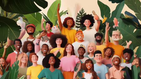Diverse group of animated characters celebrating in a lush tropical setting surrounded by greenery and vibrant wildlife during a sunny day