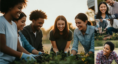 Group of young multiethnic people planting seedlings in the garden