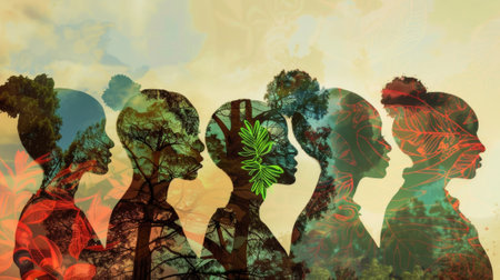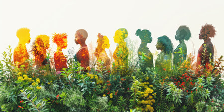 Silhouette people overlaid with vibrant floral imagery to represent diversity and nature. With Generative AI technology.