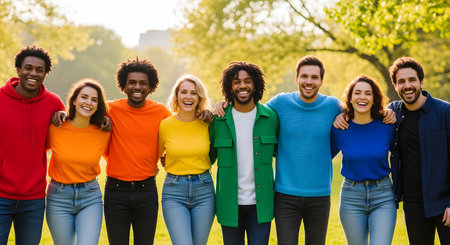 A diverse group of happy young friends stands in a row, hugging each other with arms around their shoulders in an outdoor park. They are all smiling and laughing, wearing shirts in the colors of the rainbow. The image represents friendship, diversity, unity, and inclusion.