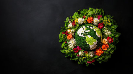 Earth made of green vegetation and colorful flowers on dark background.