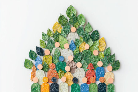 Colorful paper cutout community symbolizing unity and diversity, featuring green leaves and playful shapes, suitable for environmental themes and social awareness