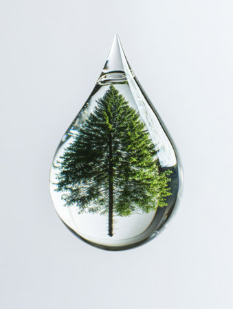 A water droplet reflects a pine forest, symbolizing natures purity and serenity against a clear white backdrop.