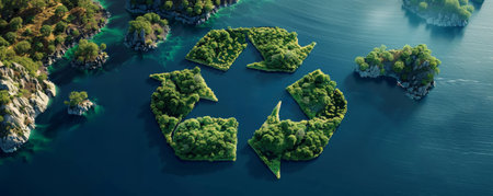 Islands shaped like recycle symbol in blue ocean, aerial view. Environmental conservation and sustainability concept