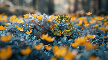 Stylized 3D rendering of a recycling symbol surrounded by green foliage, emphasizing recycling practices with this inviting photo.