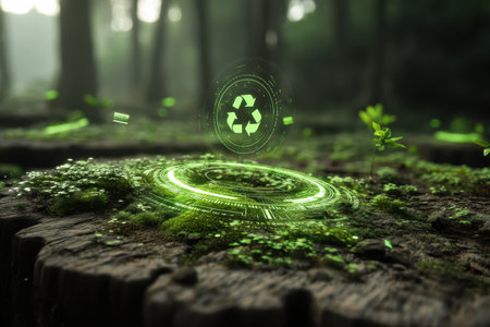 A captivating eco-themed display featuring a pulsing recycle icon set in a serene forest, symbolizing innovation and sustainability in nature.