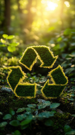 A recycling symbol made of moss, placed in a lush green forest, promoting environmental sustainability and eco-friendliness.