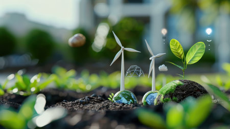 A captivating miniature scene featuring wind turbines, vibrant greenery, and a focus on renewable energy, illustrating a commitment to environmental sustainability and innovation.