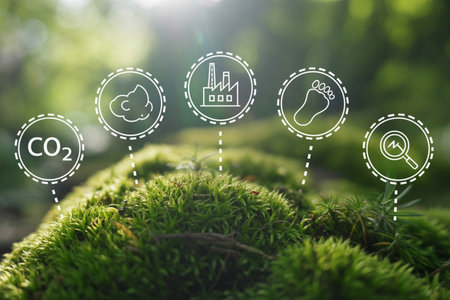 Visualizing critical environmental challenges: CO2 emissions, industrial pollution, and ecological footprint monitoring. Icons over vibrant green moss symbolize the urgent need for sustainable practices and a greener future, highlighting climate action.