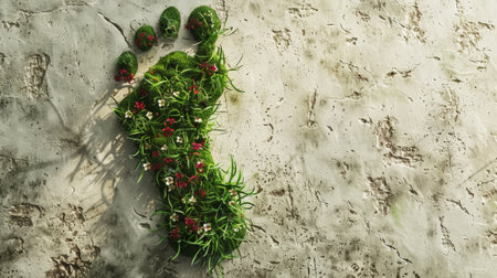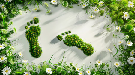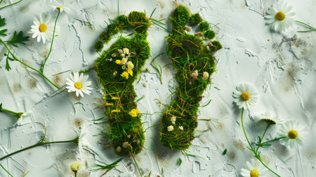 Top view of abstract human footprint made of grass and flowers texture, light background. Ecology concept. Generative AI.