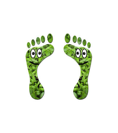 Footprints made up of green leaves to represent environmetal issues or carbon footprint with cartoon style smiling face on top.