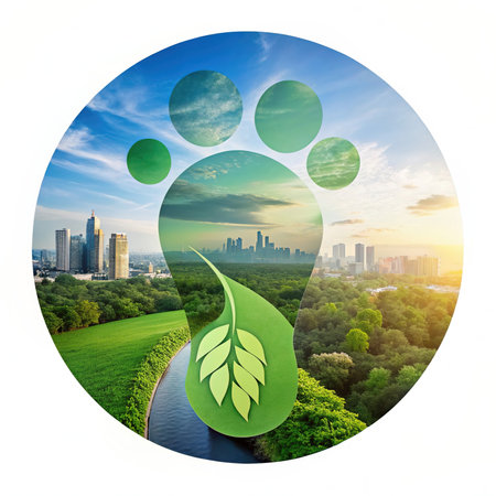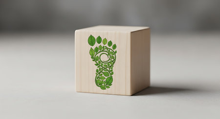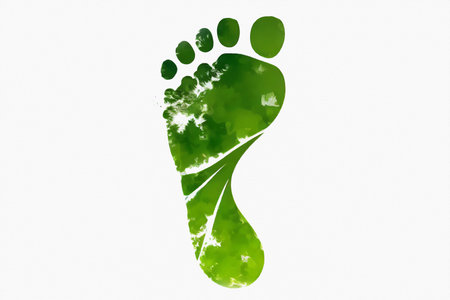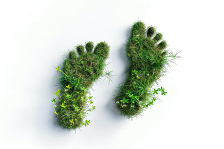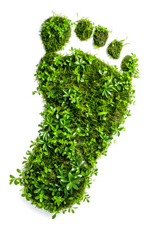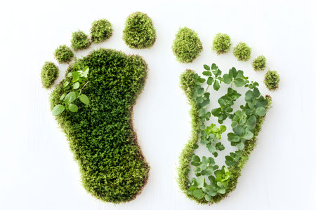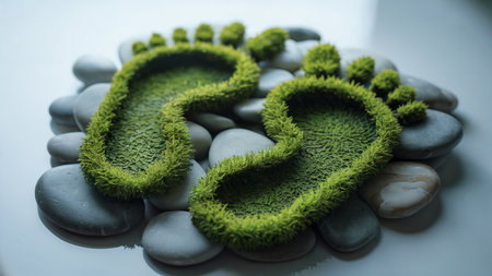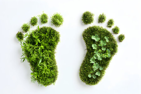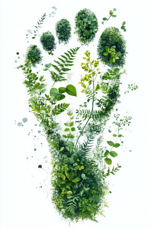 Green footprints made of moss and plants symbolize the importance of reducing our environmental impact. This illustration highlights sustainable living and the connection to nature.