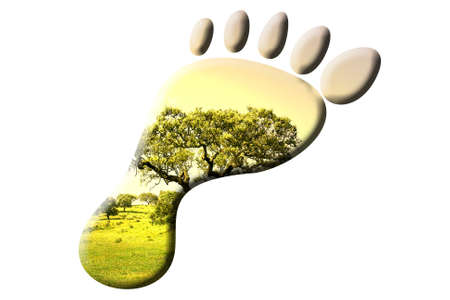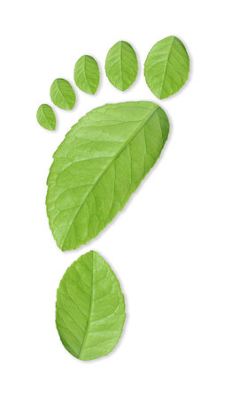 Human footprint with green leaf texture, isolated on white background, top view. The eco footprint of humanity.