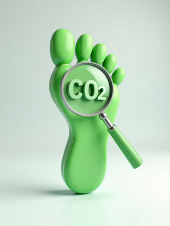An illustration shows a green footprint with a magnifying glass highlighting the chemical formula CO2. The image symbolizes the analysis of environmental impacts, sustainability, and the influence of human activities on climate.