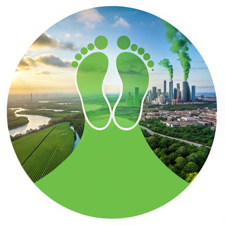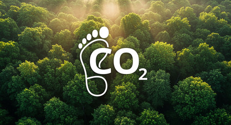 A carbon footprint reduction concept with textured footprints and tree shapes on green background showing environmental care