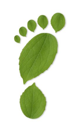 Human footprint made of green leaves on white background, top view. Environmental care, ecology protection, reducing CO2 emission
