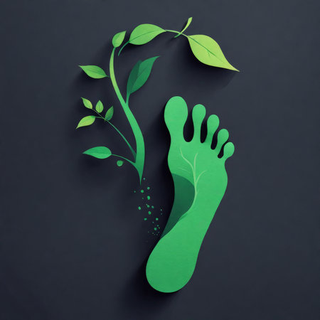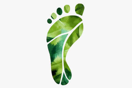 A flat illustration features a human footprint filled with vibrant green plants, conveying the message of carbon footprints and environmental awareness in a minimalist editorial style.